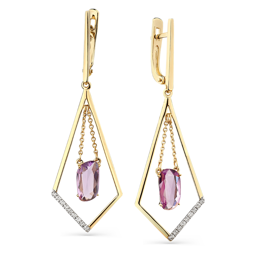 Серьги жёлтое золото 585 пробы со вставками сапфир облагороженный фиолетовый, бриллиант арт. 2-308223-00-65