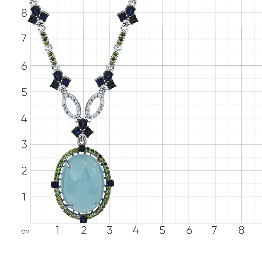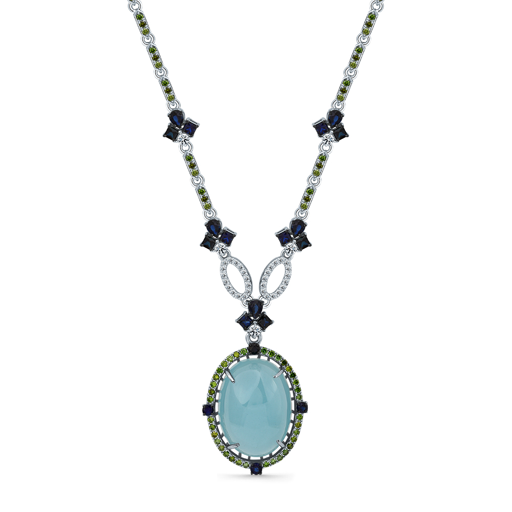 Колье белое золото 585 пробы со вставками аквамарин, бриллиант зеленый, сапфир н., бриллиант