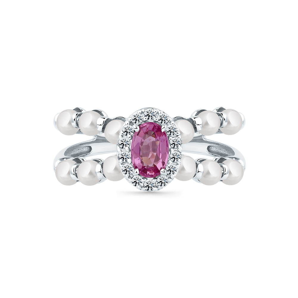 Кольцо белое золото 585 пробы со вставками жемчуг культивированный, сапфир облагороженный розовый, бриллиант арт. 1-209349-00-55