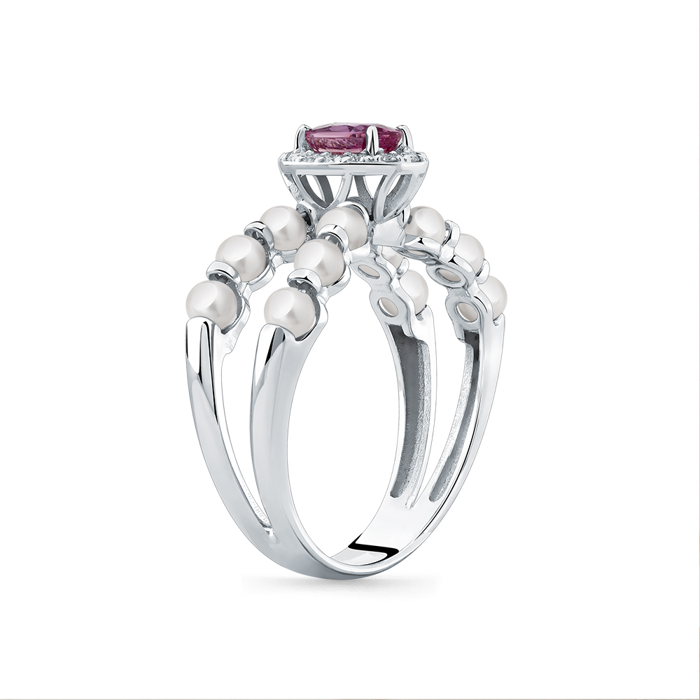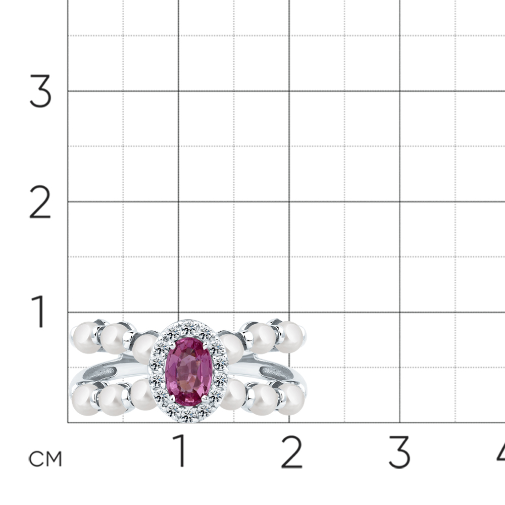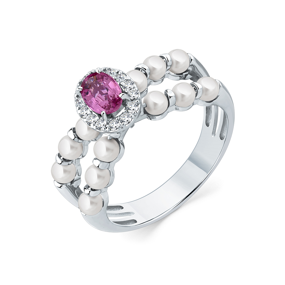 Кольцо белое золото 585 пробы со вставками жемчуг культивированный, сапфир облагороженный розовый, бриллиант