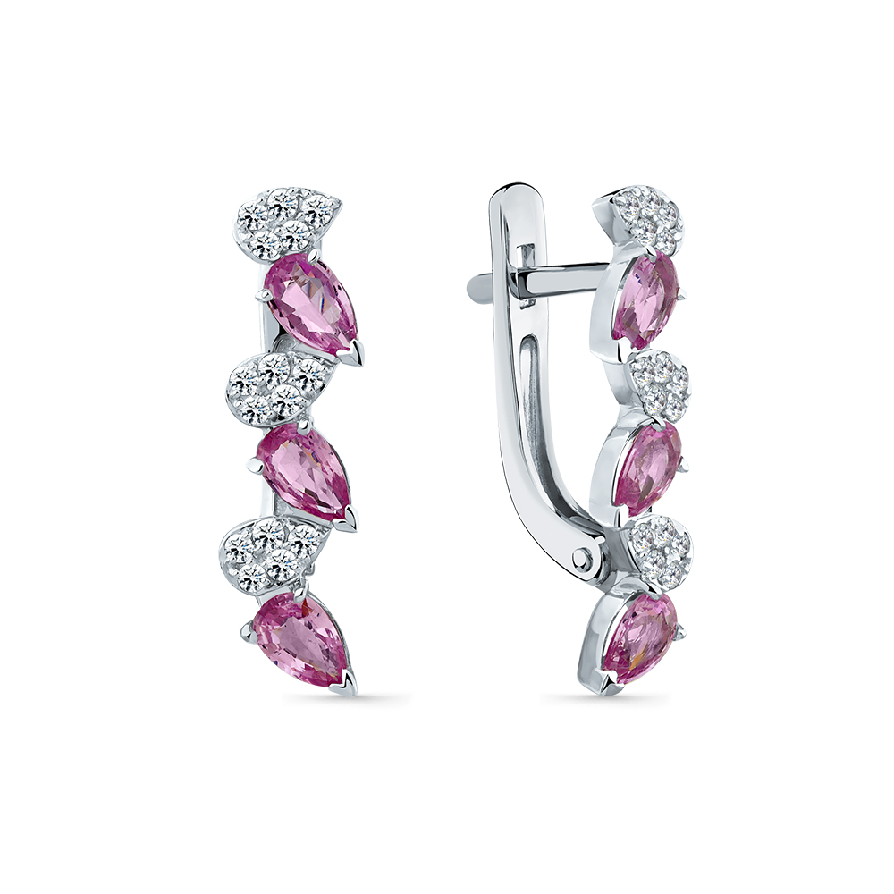 Серьги белое золото 585 пробы со вставками сапфир облагороженный розовый, бриллиант