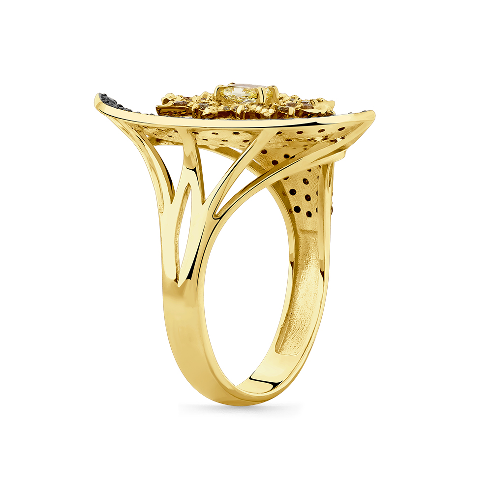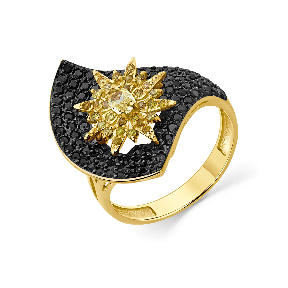 Кольцо жёлтое золото 585 пробы со вставками бриллиант черный, бриллиант лимонный, бриллиант желтый арт. 1-309373-00-55