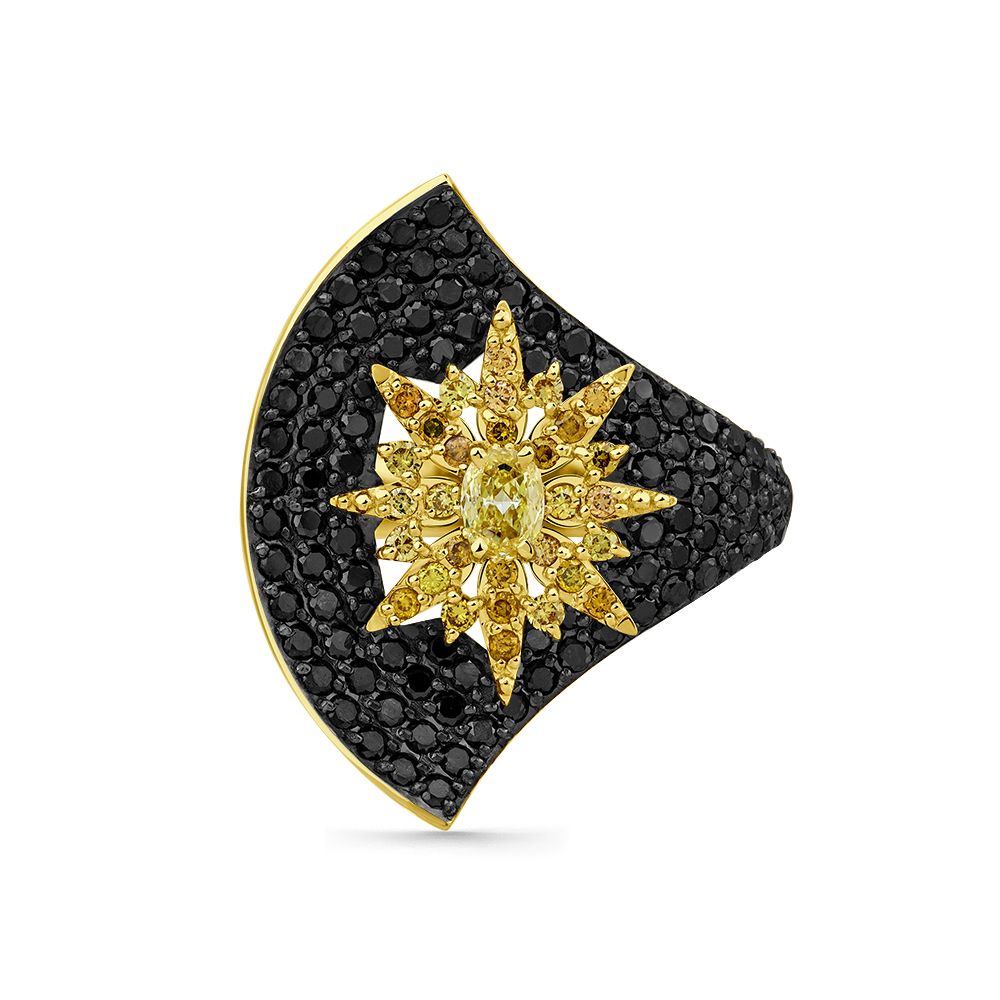 Кольцо жёлтое золото 585 пробы со вставками бриллиант черный, бриллиант лимонный, бриллиант желтый