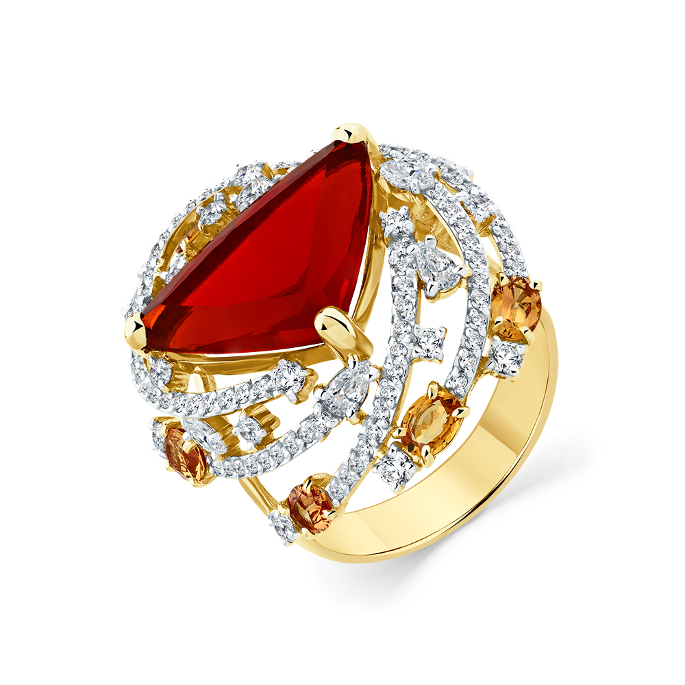 Кольцо жёлтое золото 585 пробы со вставками опал, сапфир облагороженный, бриллиант
