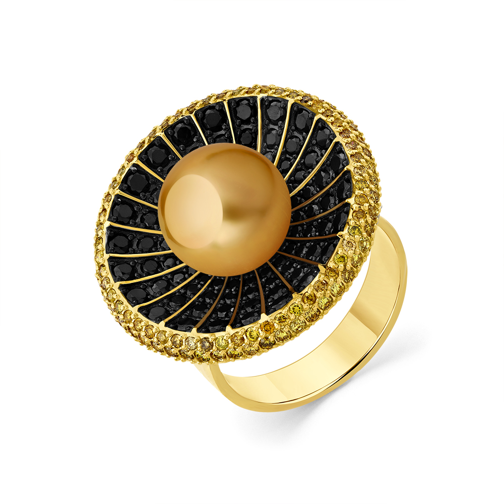 Кольцо жёлтое золото 585 пробы со вставками бриллиант, жемчуг морской, бриллиант черный, бриллиант желтый арт. 1-309162-00-57