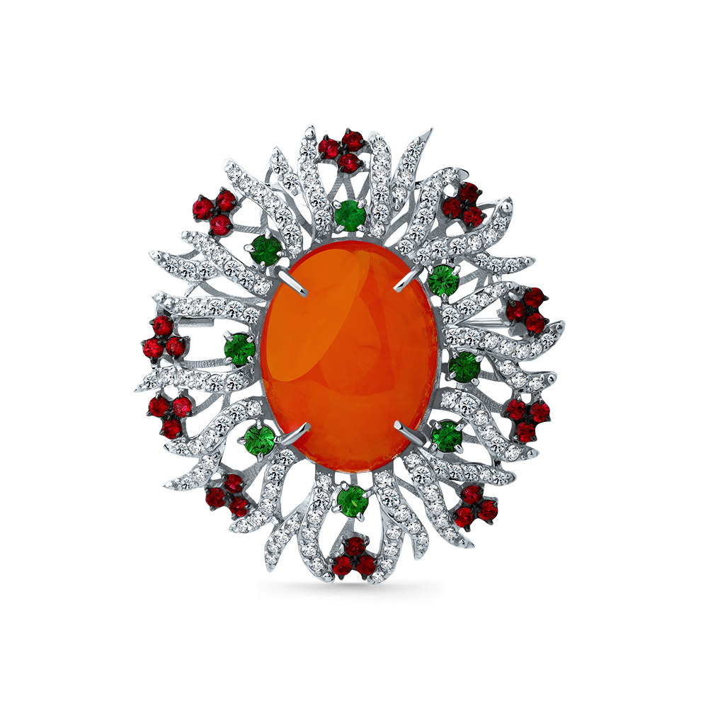 Брошь со вставками опал оранжевый, шпинель красный, бриллиант, цаворит