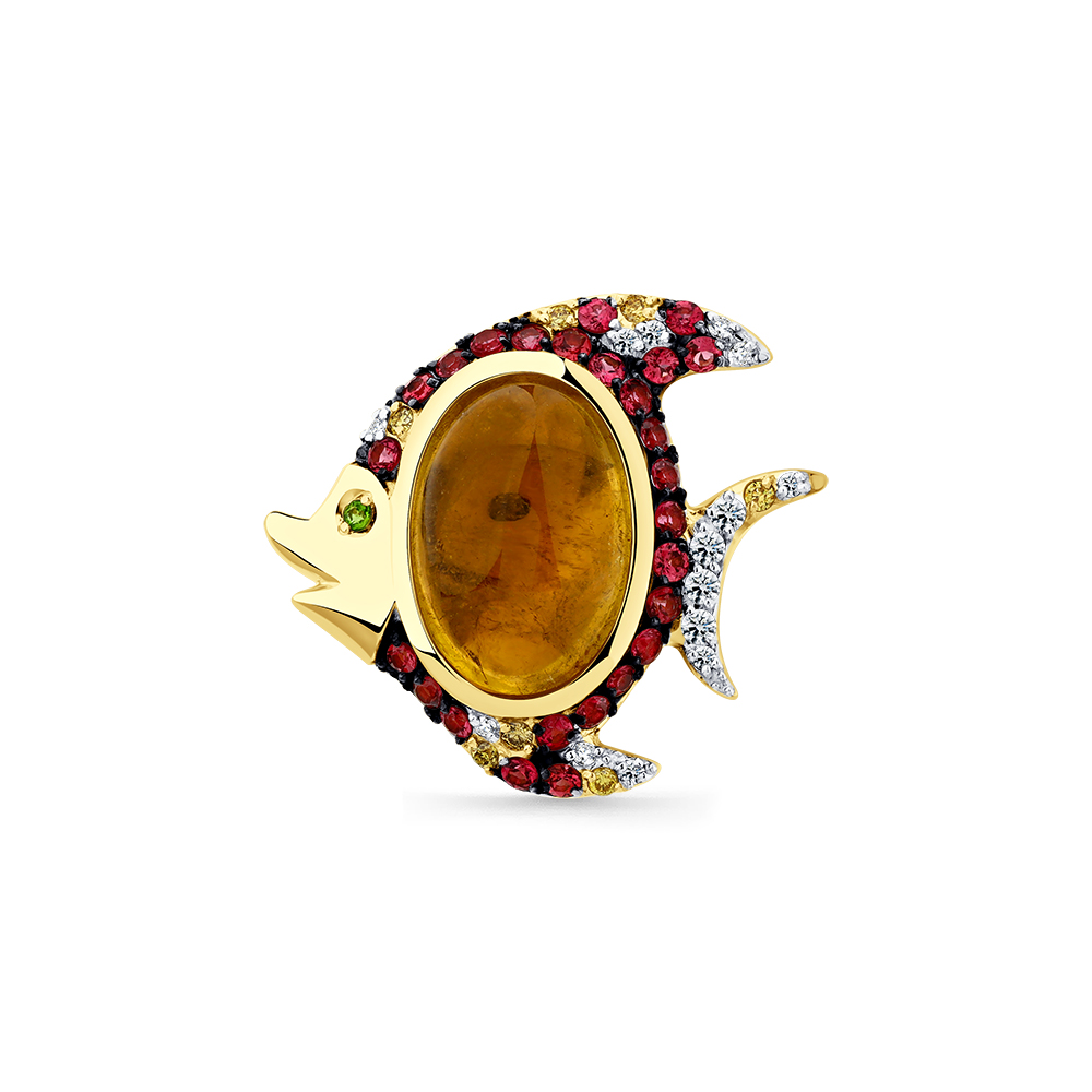 Брошь жёлтое золото 585 пробы со вставками турмалин желтый, шпинель красный, бриллиант желтый, бриллиант, хромдиопсид арт. 7-370420-00-55