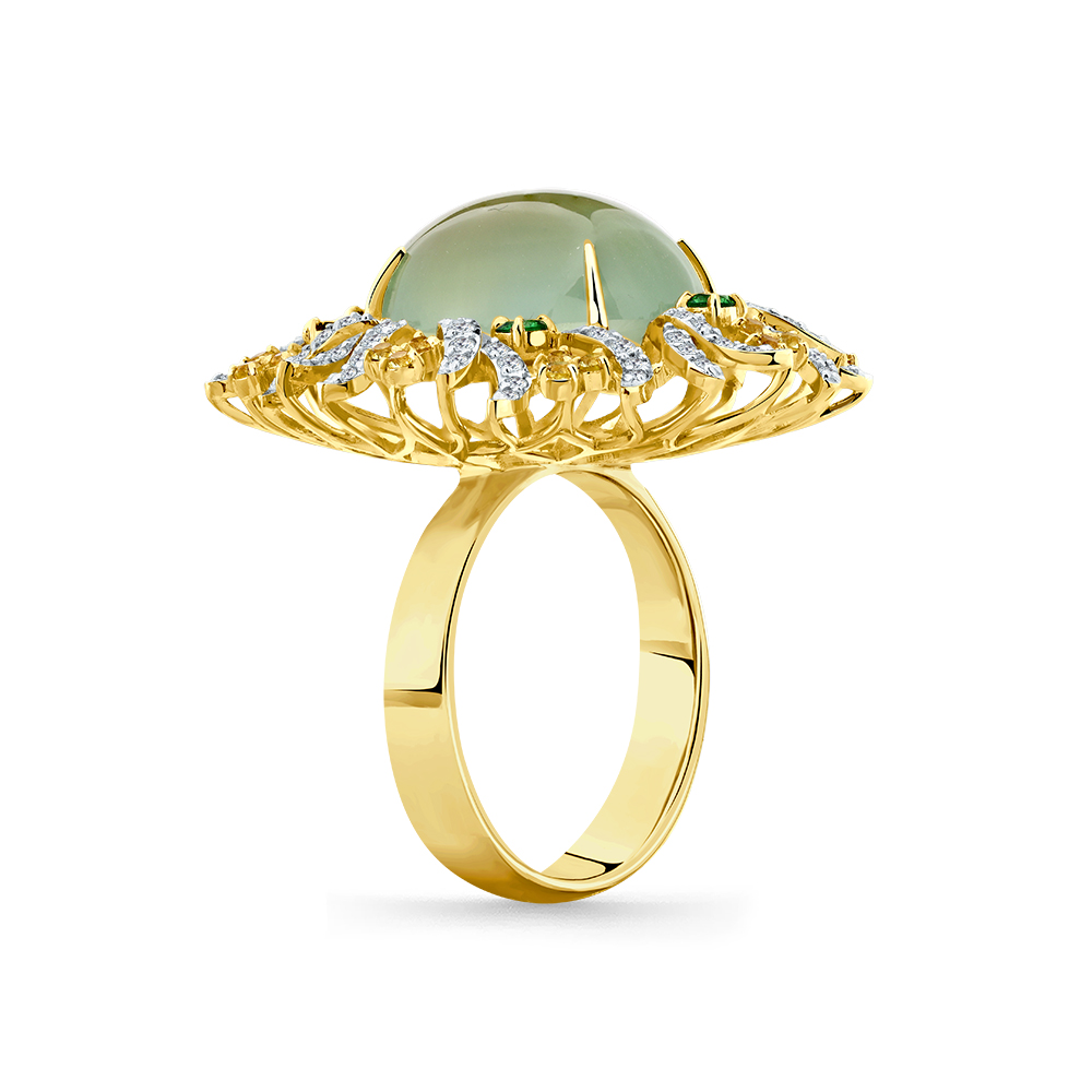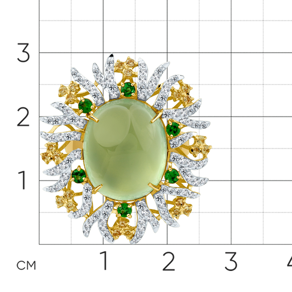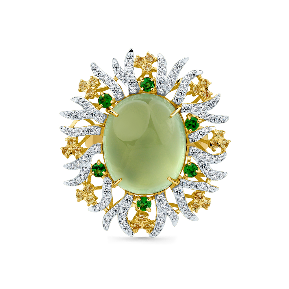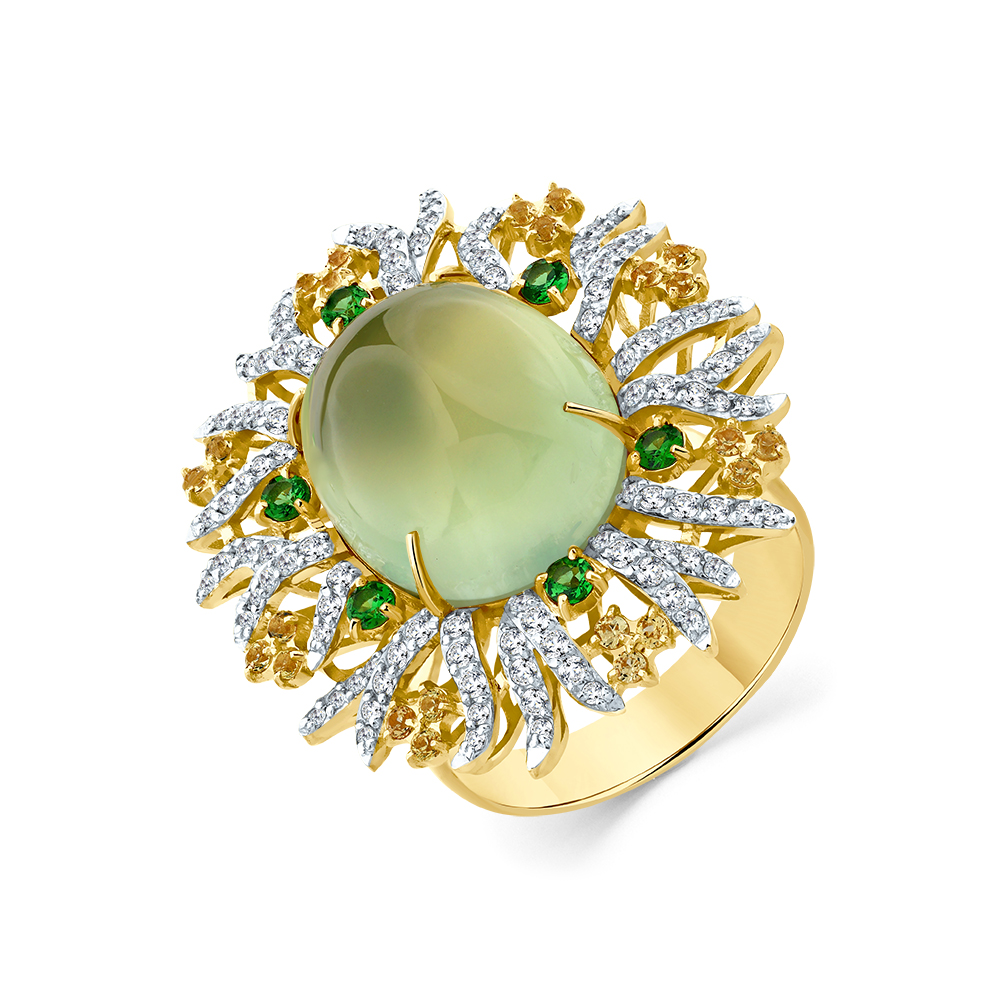 Кольцо жёлтое золото 585 пробы со вставками пренит, сапфир облагороженный, бриллиант, цаворит арт. 1-309380-00-56