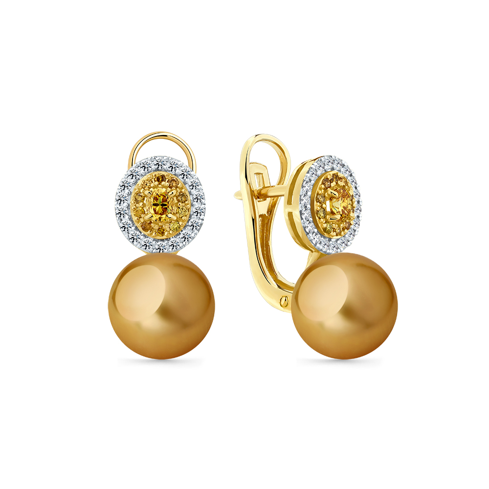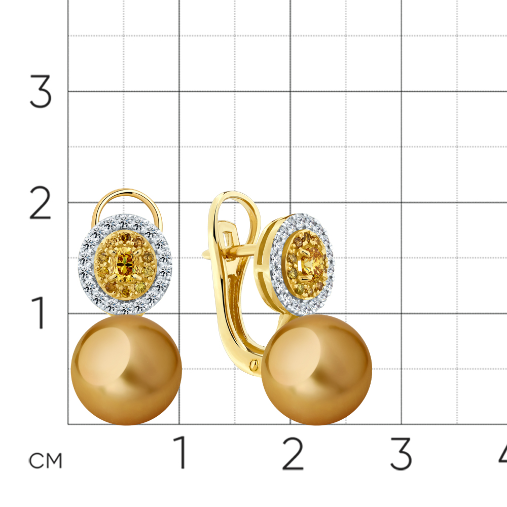 Серьги жёлтое золото 585 пробы со вставками жемчуг культивированный морской золотой, бриллиант оранжевый, бриллиант, бриллиант желтый арт. 2-309387-00-55
