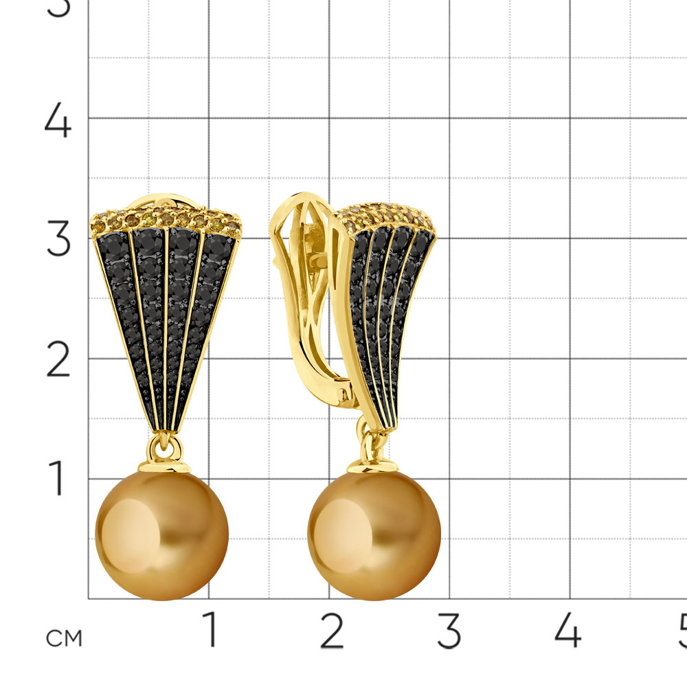 Серьги жёлтое золото 585 пробы со вставками жемчуг морской, бриллиант черный, бриллиант желтый, бриллиант