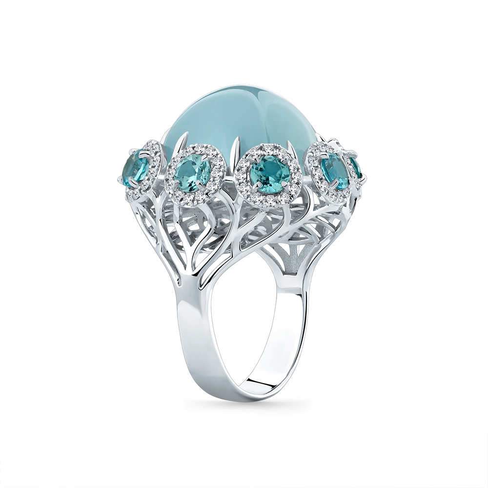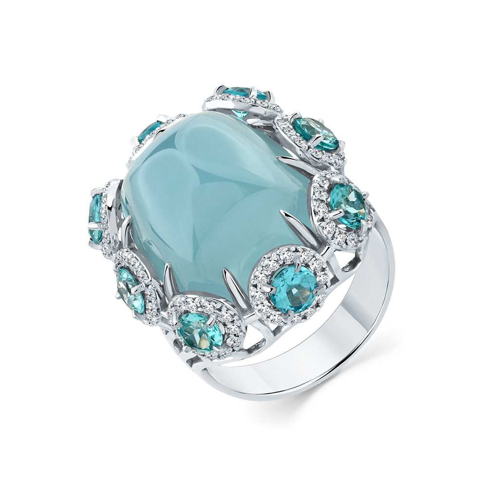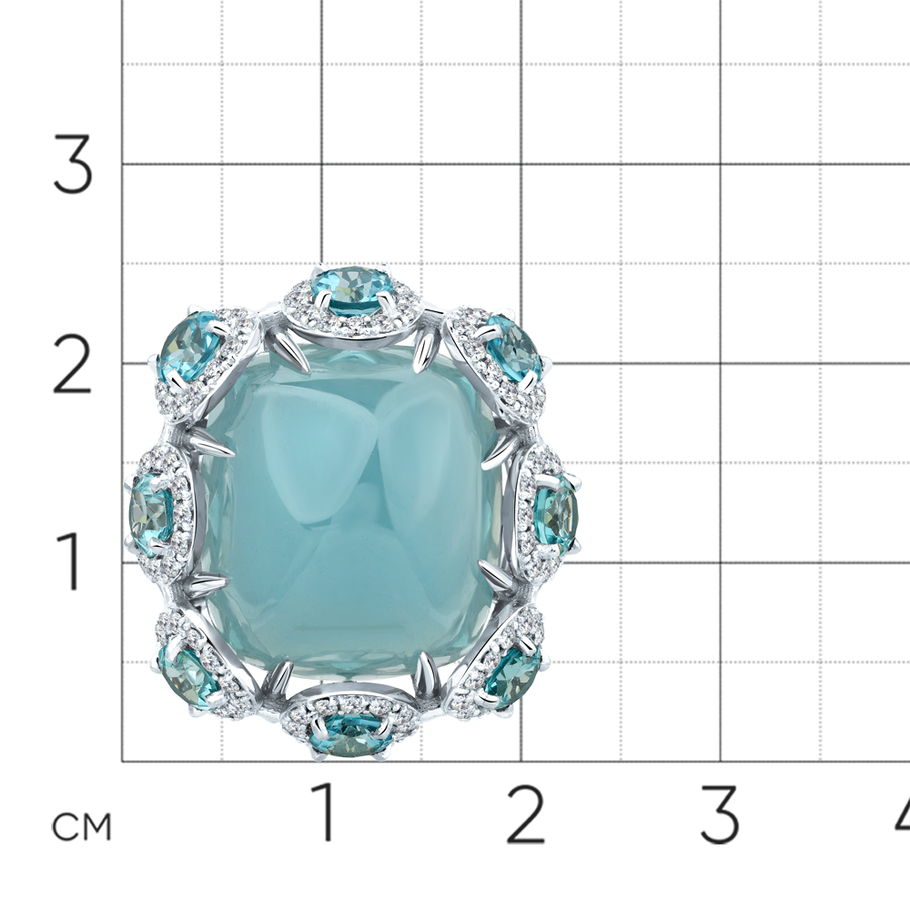 Кольцо белое золото 585 пробы со вставками аквамарин, апатит, бриллиант арт. 1-209392-00-55
