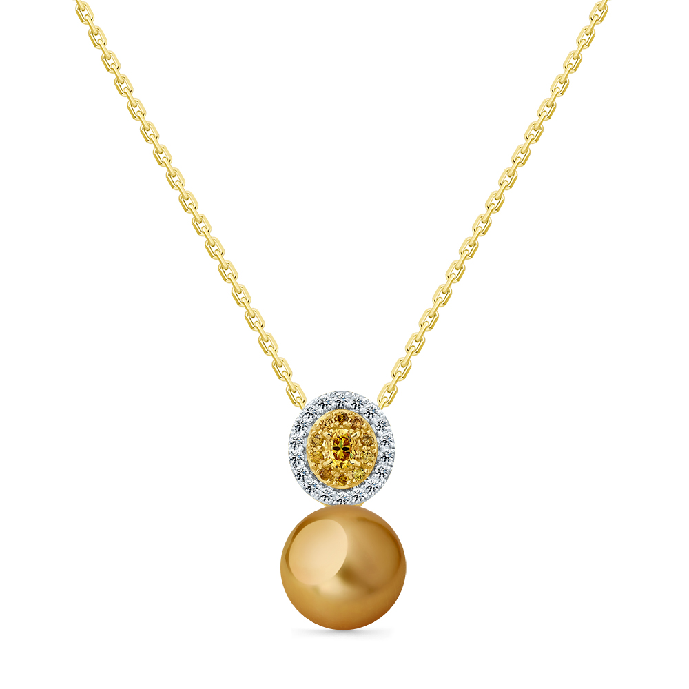 Колье жёлтое золото 585 пробы со вставками жемчуг культивированный морской, бриллиант оранжевый, бриллиант, бриллиант желтый