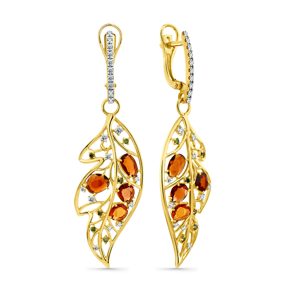 Серьги жёлтое золото 585 пробы со вставками спессартин, бриллиант, бриллиант зеленый, бриллиант облагороженный арт. 2-309391-00-55