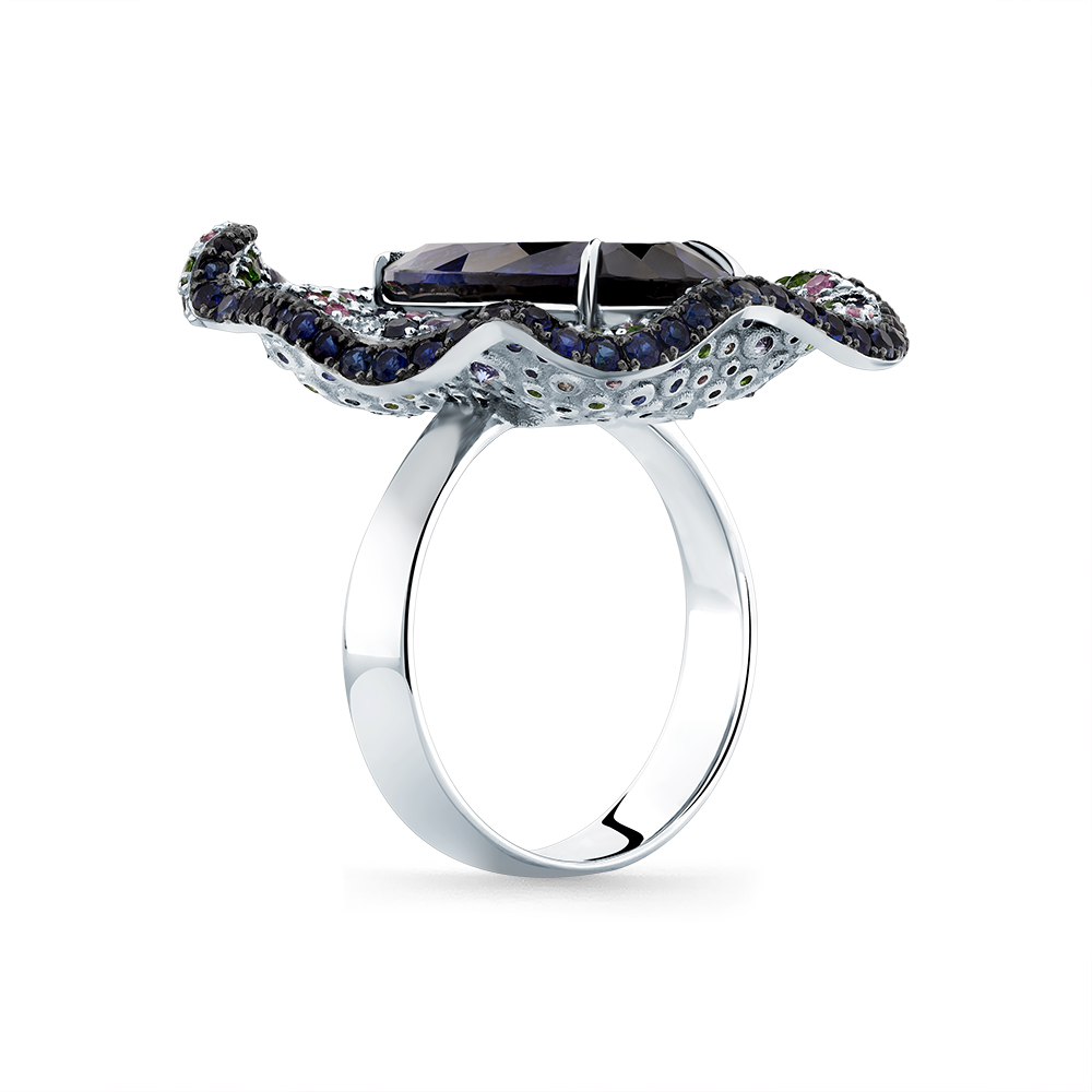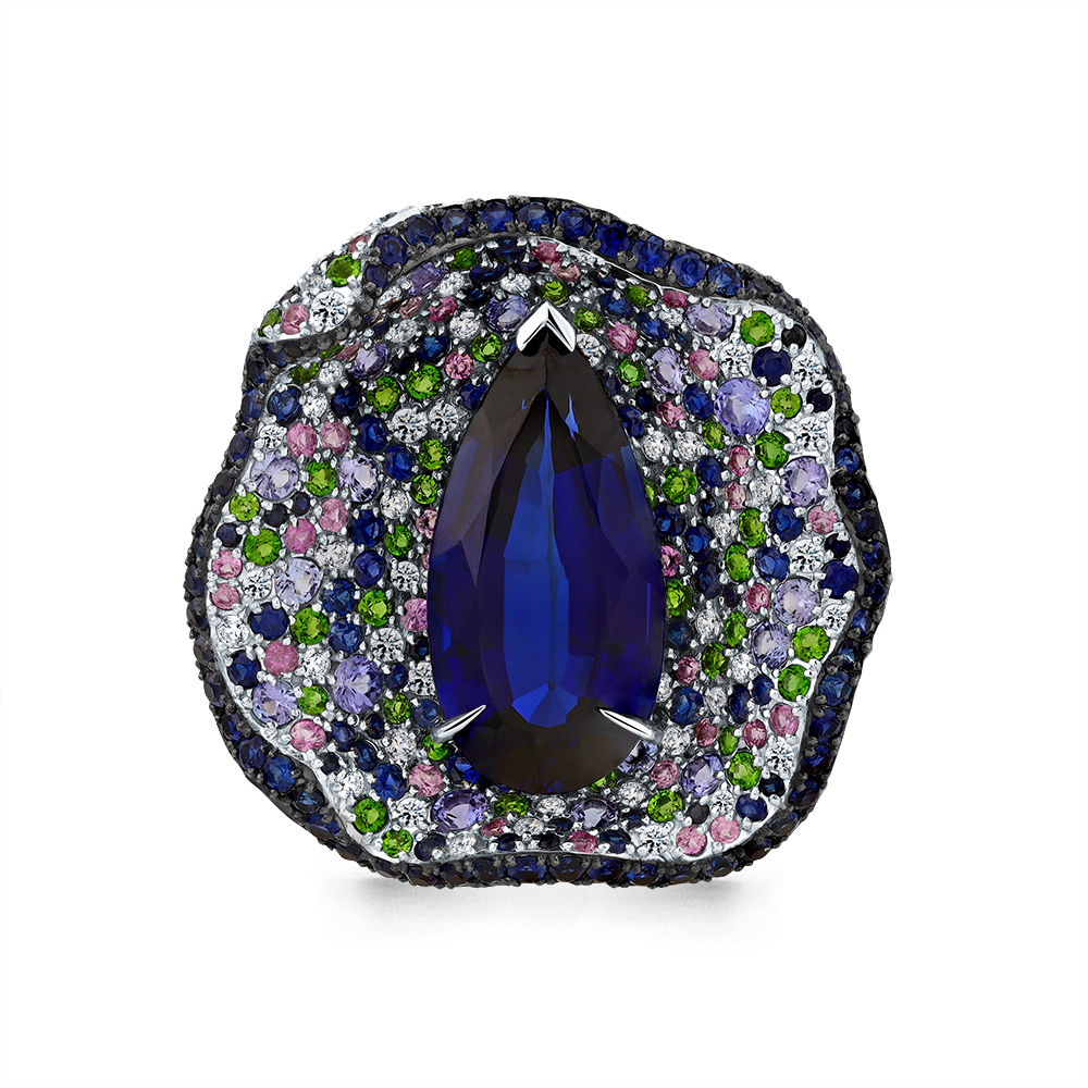 Кольцо белое золото 585 пробы со вставками бриллиант, сапфир н., сапфир синтетический, танзанит, сапфир облагороженный, хромдиопсид арт. 1-209397-00-55