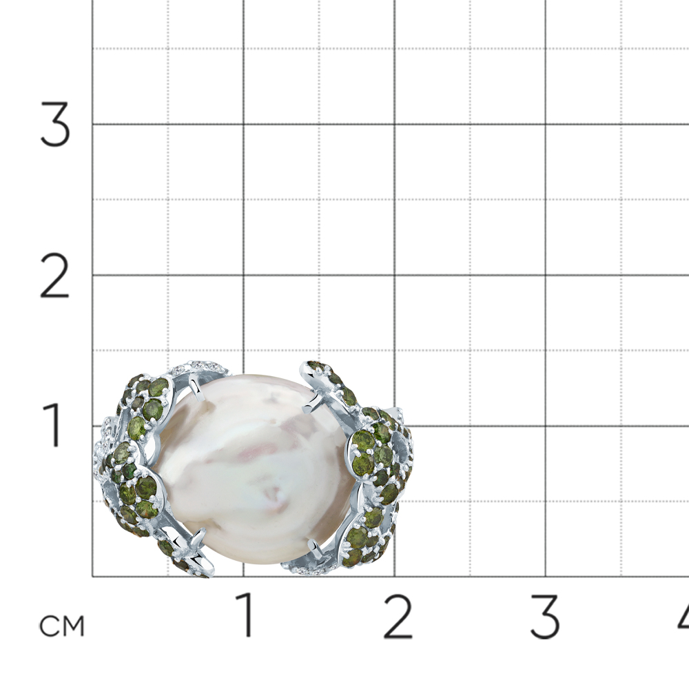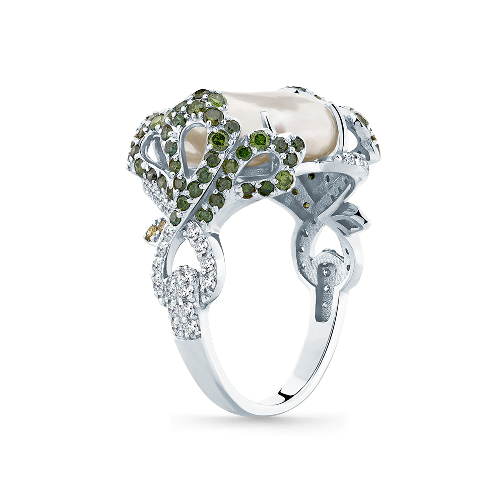 Кольцо белое золото 585 пробы со вставками бриллиант, жемчуг, бриллиант зеленый, бриллиант желтый арт. 1-209403-00-55