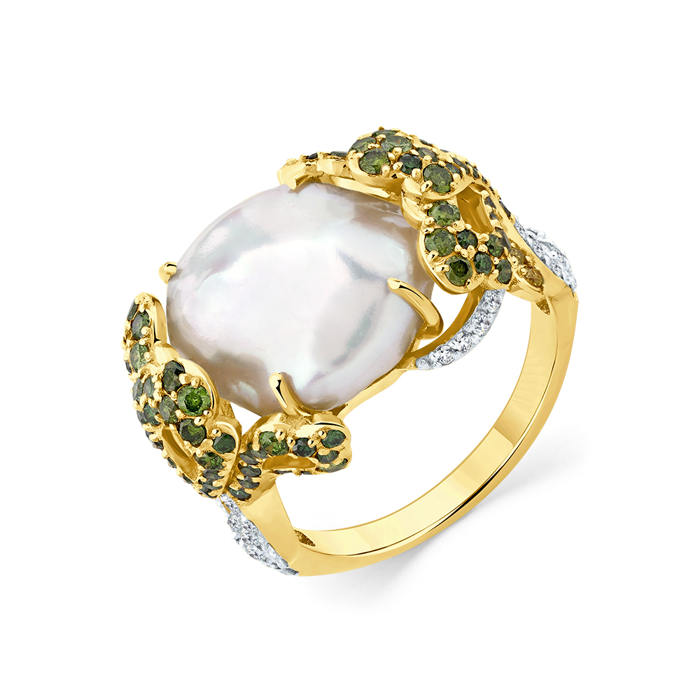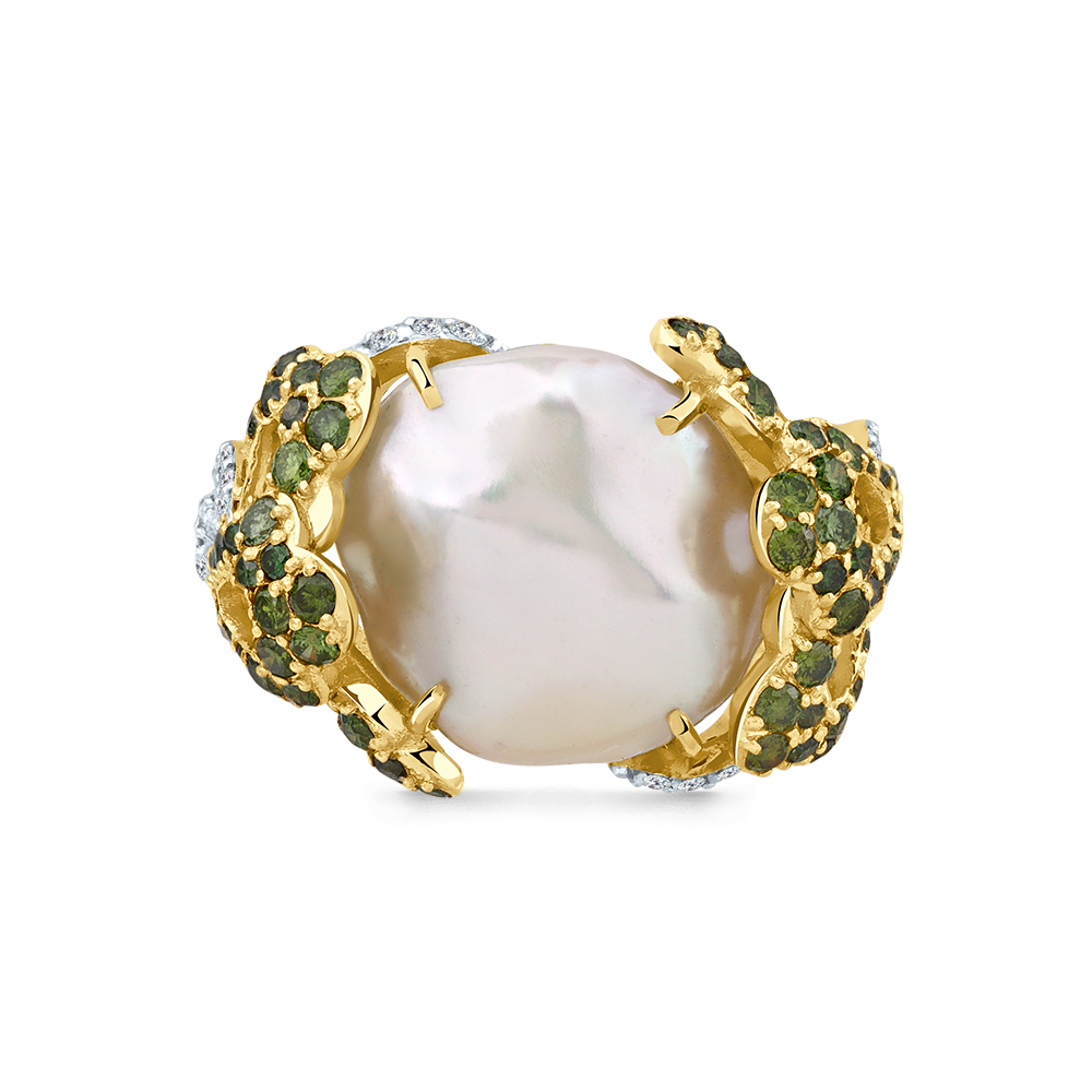 Кольцо жёлтое золото 585 пробы со вставками бриллиант, жемчуг, бриллиант зеленый, бриллиант желтый арт. 1-309403-00-55