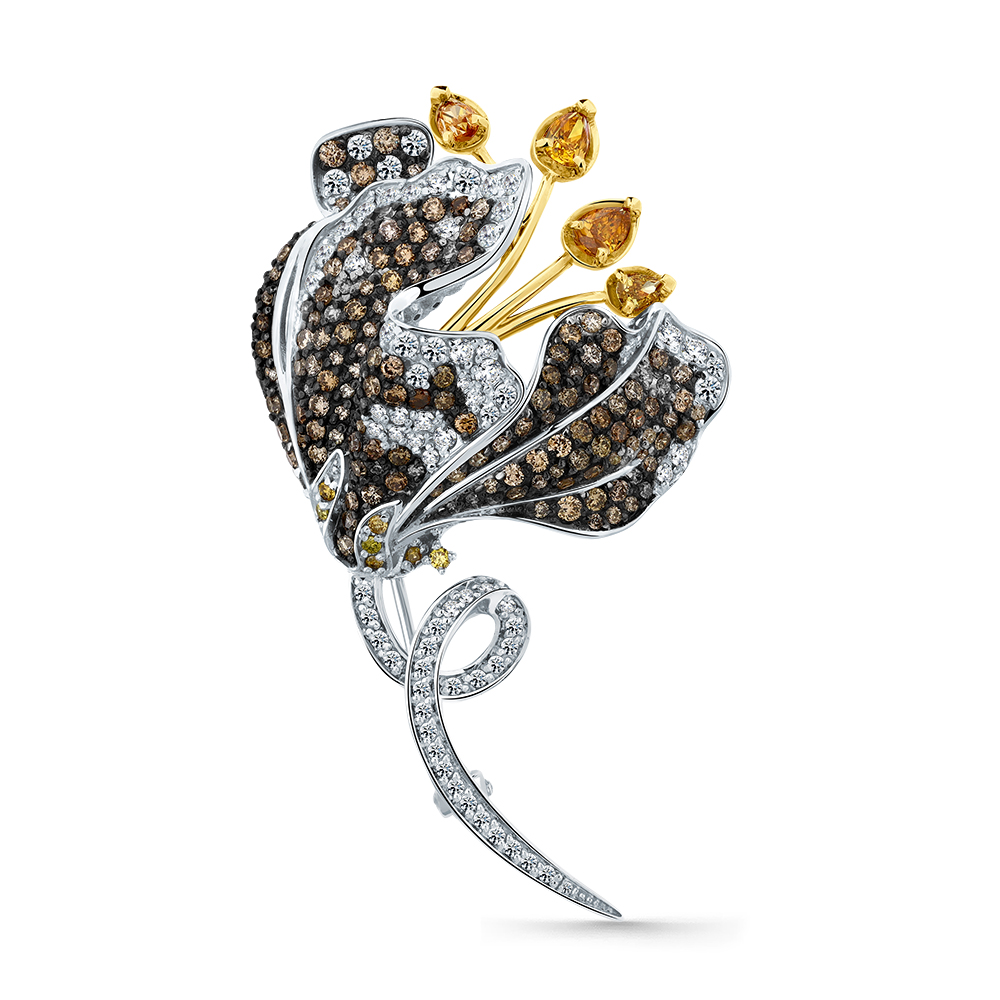 Брошь со вставками бриллиант, бриллиант коньячный, бриллиант оранжевый, бриллиант желтый