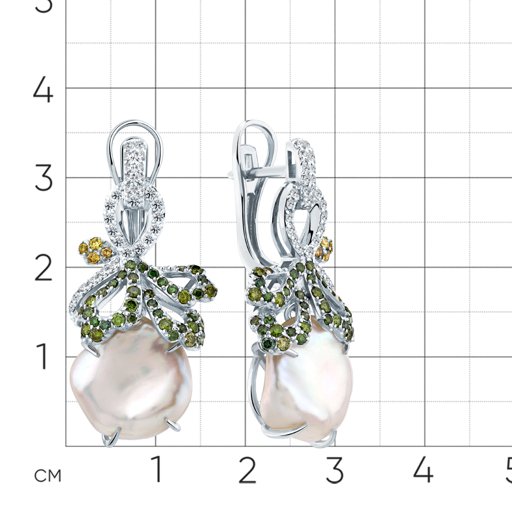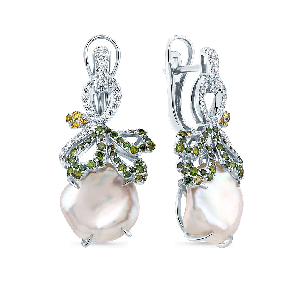 Серьги белое золото 585 пробы со вставками бриллиант, бриллиант зеленый, бриллиант лимонный, бриллиант желтый, жемчуг арт. 2-209403-00-55